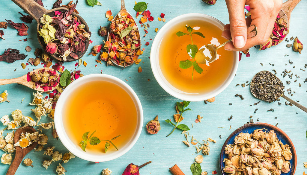Mesa azul com vários tipos diferentes de chás e duas xícaras de chás